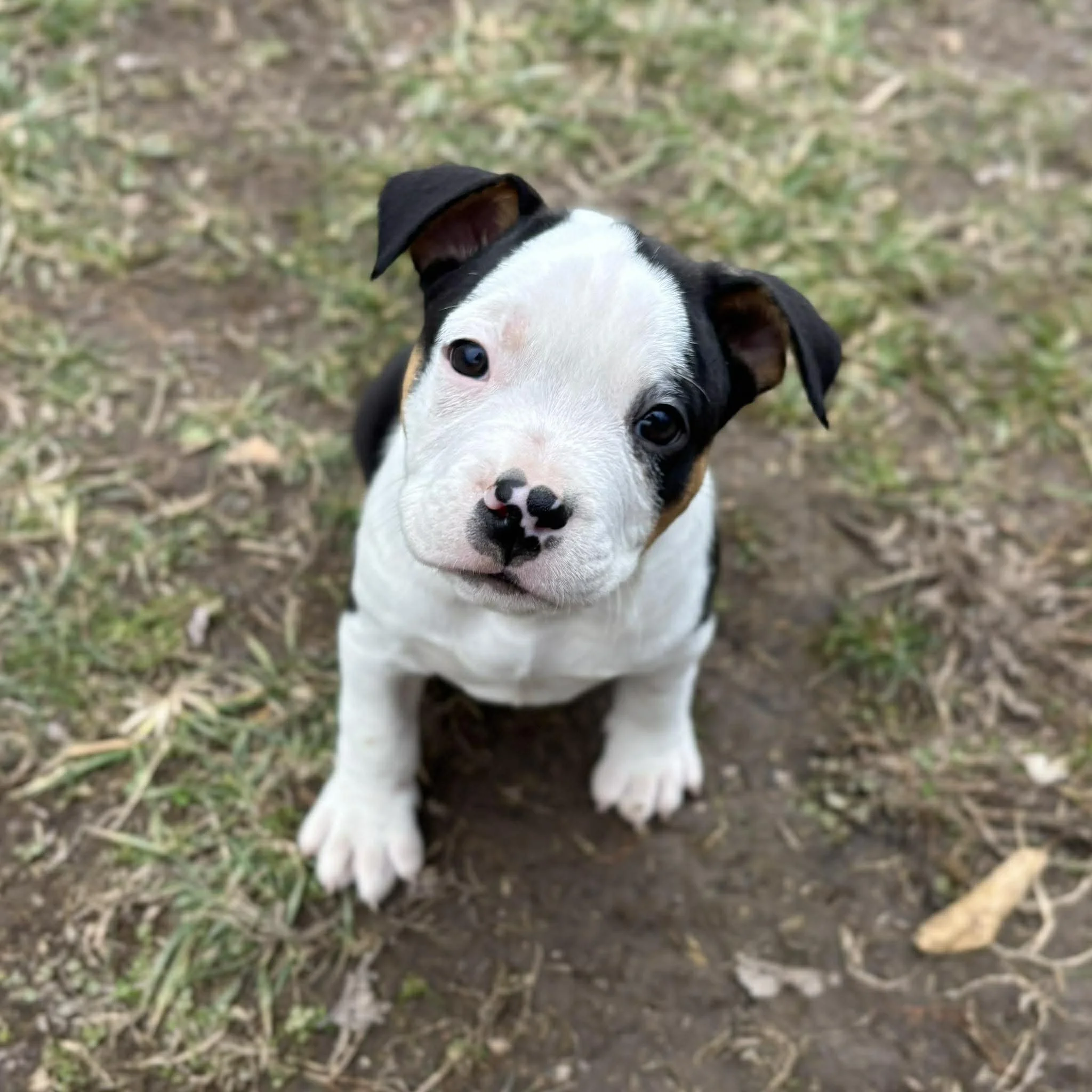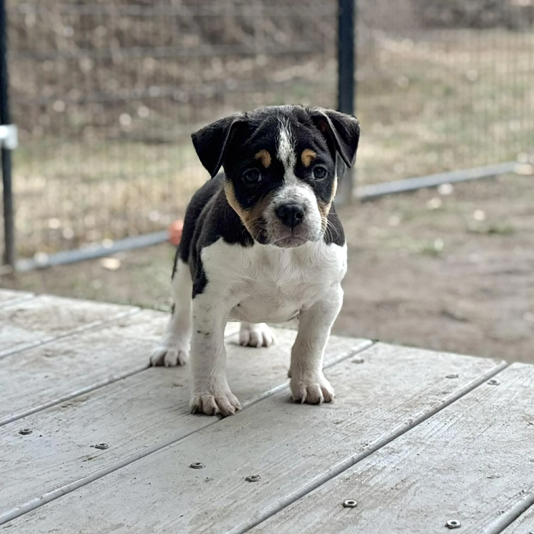 This cutie was born right around December 5th, 2025, and he has been melting hearts ever since. Their mom, Karen, is a sweet Beagle mix, and dad was a handsome American Bulldog mix — which means these pups hit the jackpot in both looks and personality.